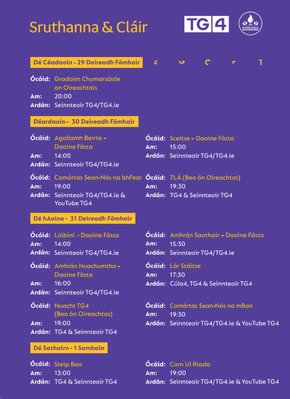 Where to watch Oireachtas na Samhna 2025: TG4, TG4.ie, YouTube TG4, Social Media Platforms : TG4, Cúla4, MOLSCÉAL, Foghlaim, BLOC.