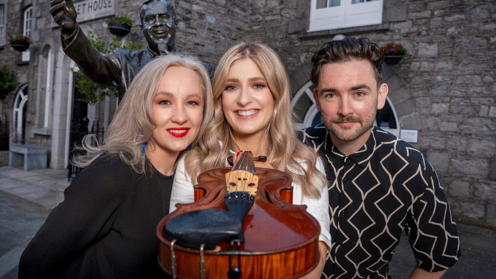 Pictiúr: Láithreoirí – Fleadh 2023: Aoife Ní Thuairisg, Doireann Ní Ghlacáin agus Peadar Ó Goill, Creidiúint: Melissa Mannion
