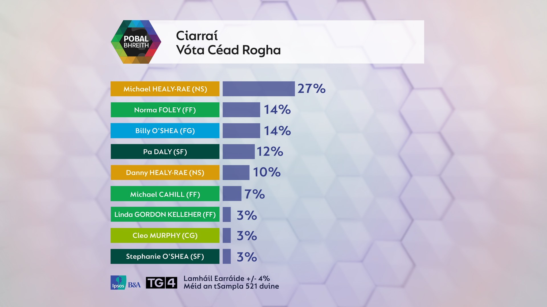 Léirigh torthaí phobalbhreith TG4 / Ipsos B&A ar dháilcheantar Chiarraí a craoladh ó Dhún Chaoin ar Nuacht TG4 anocht go bhfuair Michael Healy Rae 27% ollmhór den vóta, go raibh sé i bhfad chun tosaigh ar aon iarrthóir eile agus go mbeidh sé i measc na ndaoine a mbeidh an líon is airde vótaí sa stát aige Dé hAoine. Sa chúigiú áit a tháinig a dheartháir Danny Healy-Rae agus 10 faoin gcéad den vóta aige. Aistreofar farasbarr Michael, is é sin beagnach 40 faoin gcéad de réir na pobalbhreithe seo, chuig Danny, a chinnteoidh go mbeidh muintir Healy-Rae ar ais sa Dáil.