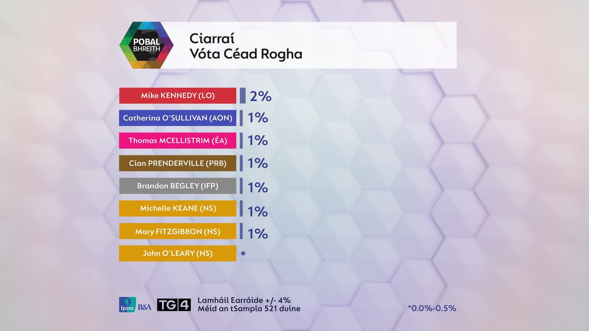 Tugadh faoi phobalbhreith TG4/Ipsos B&A Dé hAoine agus Dé Sathairn an tseachtain seo caite (an 22 agus an 23 Samhain), seachtain roimh lá an olltoghcháin. Baineann lamháil earráide thart ar móide nó lúide ceithre phointe céatadáin le sampla 521 duine.